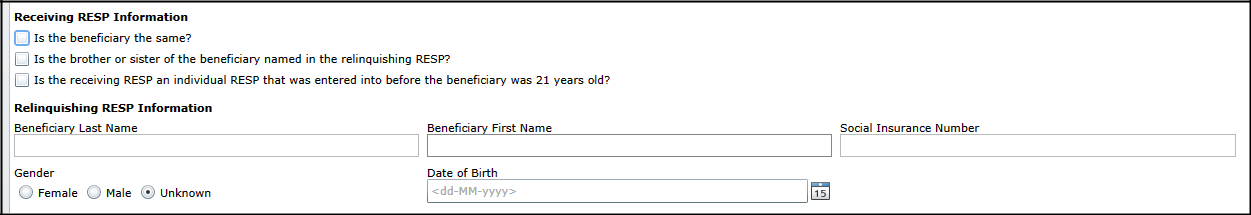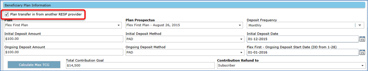 - In Beneficiary Plan Information section, tick the box next to ‘Plan Transfer In from another RESP provider’